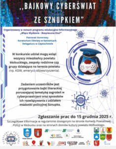 Zapraszamy do udziału w konkursie na Powiatowy Przegląd Literacki „Bajkowy Cyberświat ze Sznupkiem” organizowanym przez Komendę Powiatowej Policji w KłobucKU. Plakat oraz szczegółowe informacje wraz z potrzebnymi zgodami na udział w załącznikach. Regulamin <—- tutaj
