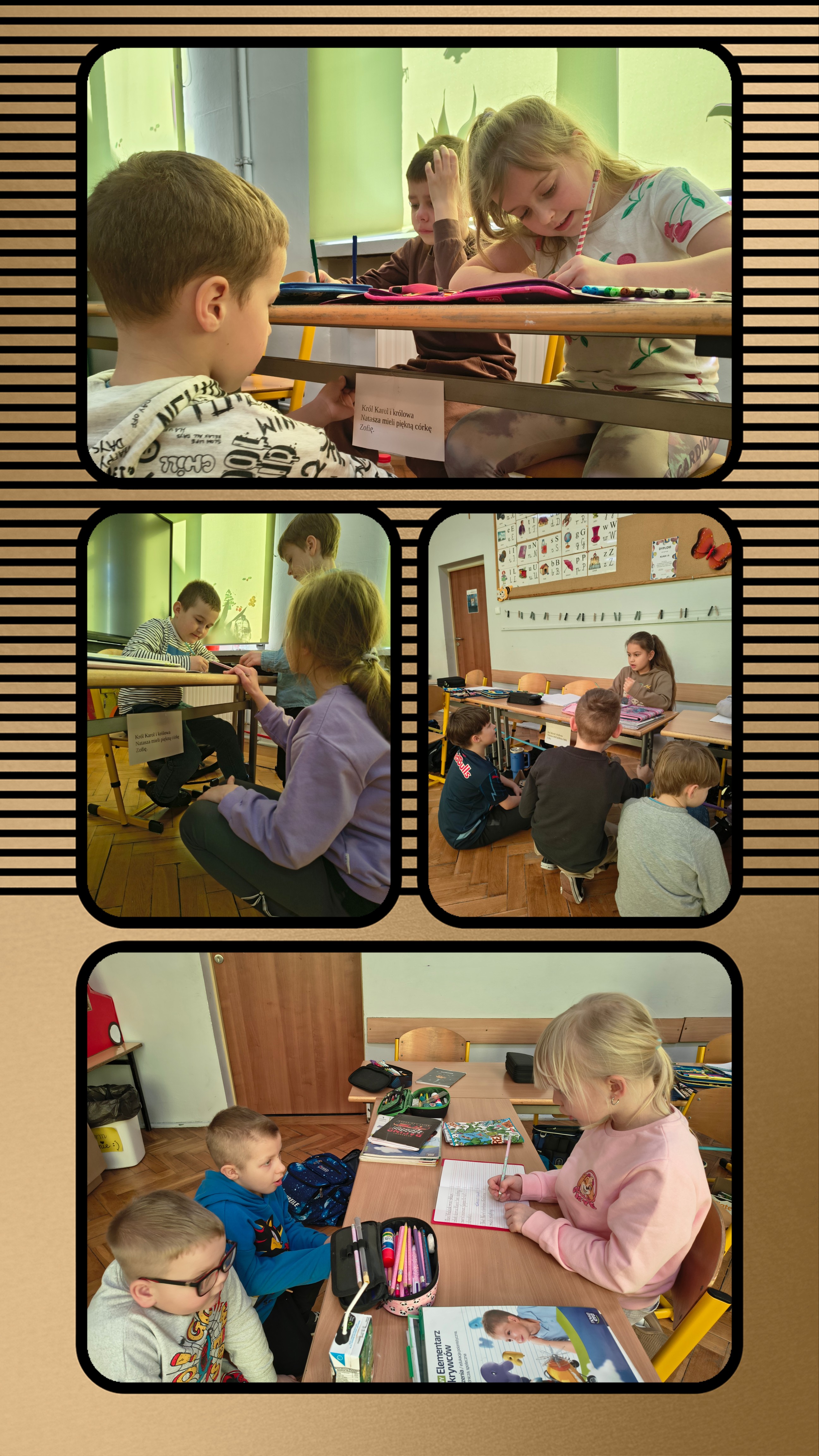 Uczniowie klasy 1a wzięli udział w dyktandzie stolikowym. Pod każdą ławką przyklejono kartkę z wyrazami zawierającymi trudności ortograficzne. Uczniowie pracowali w grupach. Jedno z dzieci było pisarzem, a drugie biegaczem. Biegacz podbiegał do kartki, zapamiętywał wyrazy, a następnie wracał, aby podyktować tekst pisarzowi.