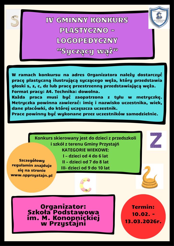 W ramach konkursu na adres Organizatora należy dostarczyć pracę plastyczną ilustrującą syczącego węża, który przedstawia głoski s, z, c, dz lub pracę przestrzenną przedstawiającą węża.