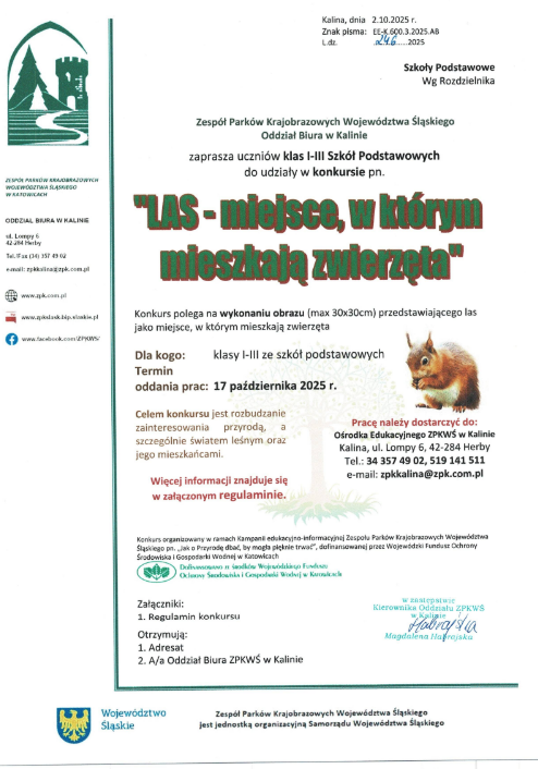 Konkurs plastyczny „Las miejsce, w którym mieszkają zwierzęta” Zespół Parków Krajobrazowych Województwa Śląskiego, Oddział Biura w Kalinie.