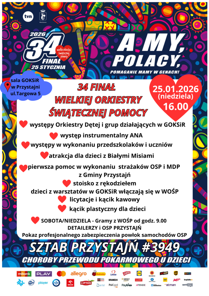 W niedzielę 25.01.2026 r. od godz. 16.00 sala GOKSiR w Przystajni zamienia się w SZTAB. Głównym punktem programu będą liczne licytacje, do udziału w których bardzo zachęcamy. Oprócz gadżetów z logo WOŚP, nasze serca otwierają przed nami lokalni przedsiębiorcy i nie tylko przekazując gadżety na aukcje, zachęcamy więc do przyjścia na finał i dołożenia swojej cegiełki.